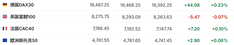 2. 截至发稿,德国DAX指数涨0.23%,英国富时100指数跌0.07%,法国CAC40指数涨0.10%,欧洲斯托克50指数涨0.06%。