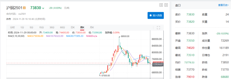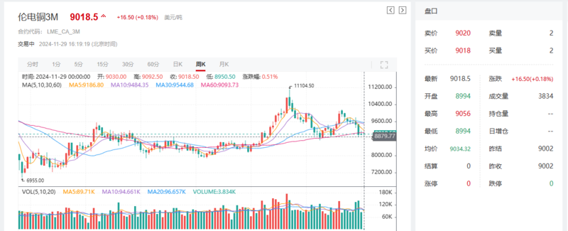 SMM11月29日讯:美元指数本周整体出现下行,目前徘徊在106下方,本周宏观消息整体偏淡静;基本面上国内铜库存连续六周周度去库但周内库存出现上升,铜价本周延续了上周窄幅波动的状态继续偏弱震荡。截至11月29日16:19分,伦铜涨0.18%,报9018.5美元/吨,本周周度涨幅暂时为0.56%;沪铜跌0.03%,报73830元/吨,本周周度跌幅为0.12%。