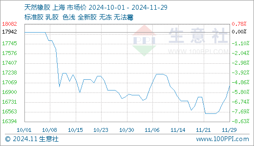 据生意社商品行情分析系统,11月以来国内天然橡胶现货市场行情区间震荡为主,截止到11月29日我国天然橡胶市场现货胶行情在17027元/吨左右,较月初的16855元/吨上涨了1.02%,周期内高点在17221元/吨,低点在16535元/吨。