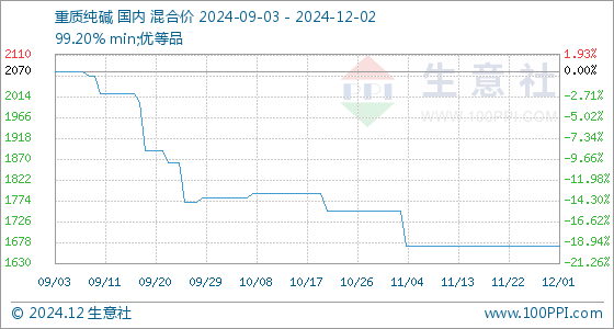 12月2日,生意社重质纯碱基准价为1670.00元/吨,与本月初持平。