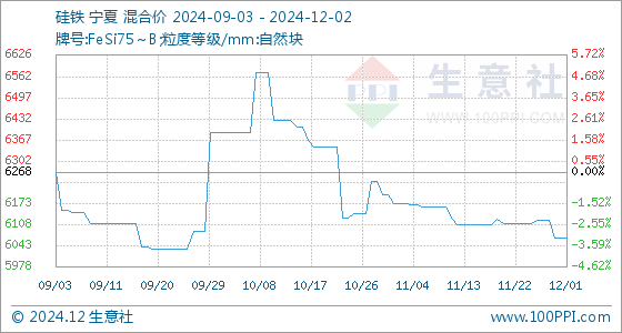 12月2日,生意社硅铁基准价为6067.14元/吨,与本月初持平。