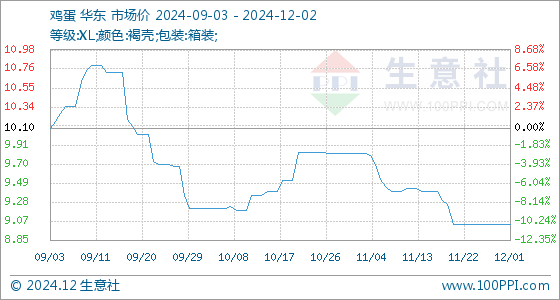 12月2日,生意社鸡蛋基准价为9.03元/公斤,与本月初持平。