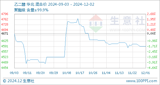 12月2日,生意社乙二醇基准价为4591.67元/吨,与本月初持平。