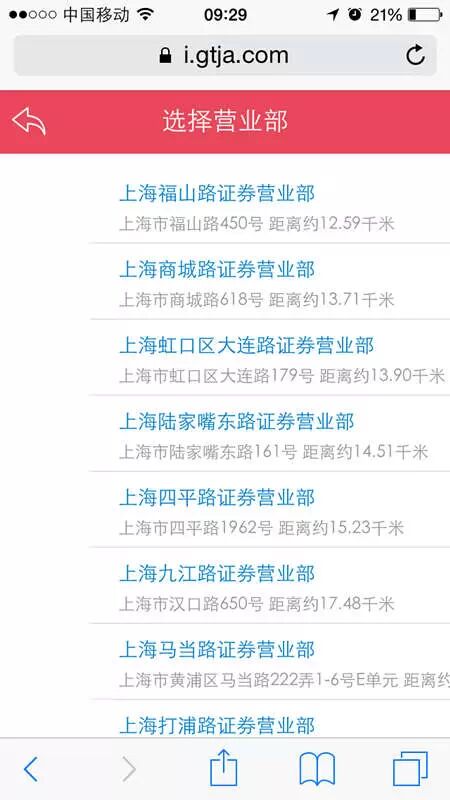 您可以根据省市手动选择拟开户营业部,如果手机开通GPS定位,也可以直接点击“附近营业部”,系统根据地理位置定位,由近到远列出本地所有的营业部供选择。