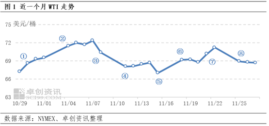 2024年11月,国际原油价格呈现“N”型走势,仍旧延续宽幅震荡态势,但波动幅度较前两个月有所收敛。截至11月27日周盘,本月美国原油月均价69.61美元/桶,环比下降2.64%,同比下跌10.04%;布伦特原油月均价73.35美元/桶,较上月下跌2.6%,较去年同期同比下跌10.58%。根据整体11月驱动油价变动较大幅度的事件整理(图1和表1),可以发现11月市场受宏观、地缘和供应扰动因素影响明显,多空交织,走势震荡。