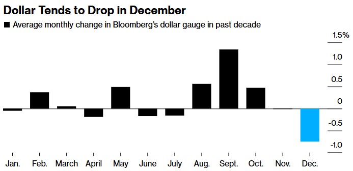 尽管特朗普胜选提振美元,但美元多头正进入一个历史上一直对美元不利的月份。自11月5日大选日以来,美元已升值约2%,但季节性因素显示,从现在开始,美元升值的可能性不大。在最近10年所有的12月份里,美元有8次出现下跌,往往是年末投资组合再平衡流动和所谓的“圣诞反弹”(Santa Rally)的牺牲品。圣诞反弹激励着交易商抛售美元,买入股票等风险较高的资产。