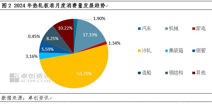 分领域来看,2024年热轧板卷下游行业依旧主要集中在冷轧板卷、机械、建筑钢结构、集装箱、钢管、汽车、家电等领域(各领域占比见图2)。