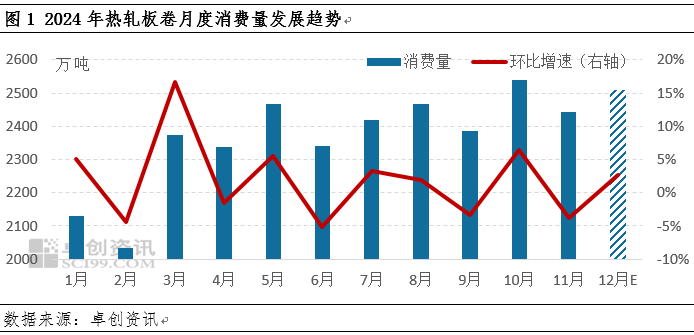 近年来,国内热轧板消费量持续增长,预计2024年国内消费量达到28450万吨以上,同比去年增长5.8%左右。卓创资讯根据2024年各月份热轧板卷国内消费量的变化制得图1,可以看到低点在2月份,为2033万吨,高点在10月份,为2539万吨。