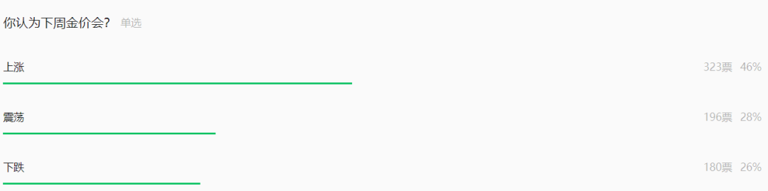 11月25日当周,伦敦金价格开盘2711.19美元/盎司,最高2721.44美元/盎司,最低2605.12美元/盎司,收盘2655.16美元/盎司。北京黄金经济发展研究中心调查显示,市场人士认为本周国际金价震荡可能性较大。投票显示,有46%的读者看涨本周金价、28%看震荡、26%看空。