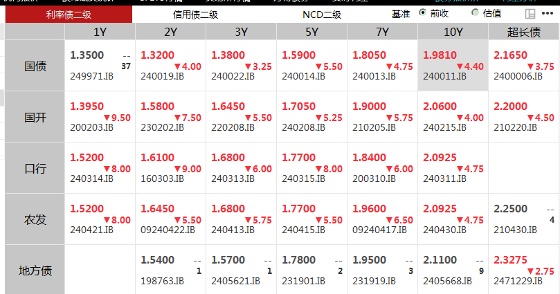 截至发稿,30年期国债活跃券收益率下行3.75个基点,报2.1650%;10年期国债活跃券收益率下行4.4个基点,报1.9810%;5年期国债活跃券收益率下行5.5个基点,报1.5900%;2年期国债活跃券收益率下行4个基点,报1.3200%。