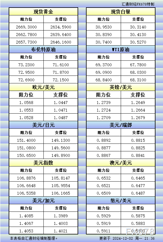 汇通财经APP讯——12月2日美市更新的黄金、白银、原油、美元指数、欧元、英镑、日元、瑞郎、澳元、加元、纽元支撑阻力位一览。