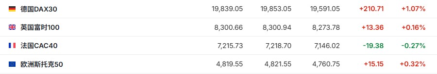 2. 截至发稿,德国DAX指数涨1.07%,英国富时100指数涨0.16%,法国CAC40指数跌0.27%,欧洲斯托克50指数涨0.32%。