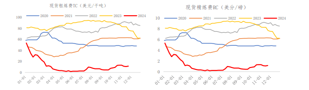 成本方面:截至11月22日最新数据显示,现货粗炼费(TC)11.4美元/干吨,现货精炼费(RC) 1.15美分/磅。