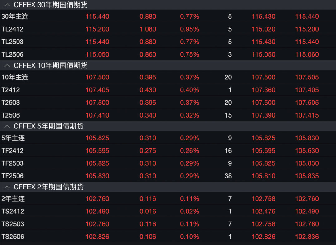 国债期货全线飘红。数据显示,截至当日收盘,30年期国债期货主力合约涨0.77%,报115.44元,为9月底以来新高;10年期国债期货主力合约涨0.37%、报107.50元,5年期国债期货主力合约涨0.29%、报105.83元,均创收盘价新高;2年期国债期货主力合约涨0.11%,报102.76元。
