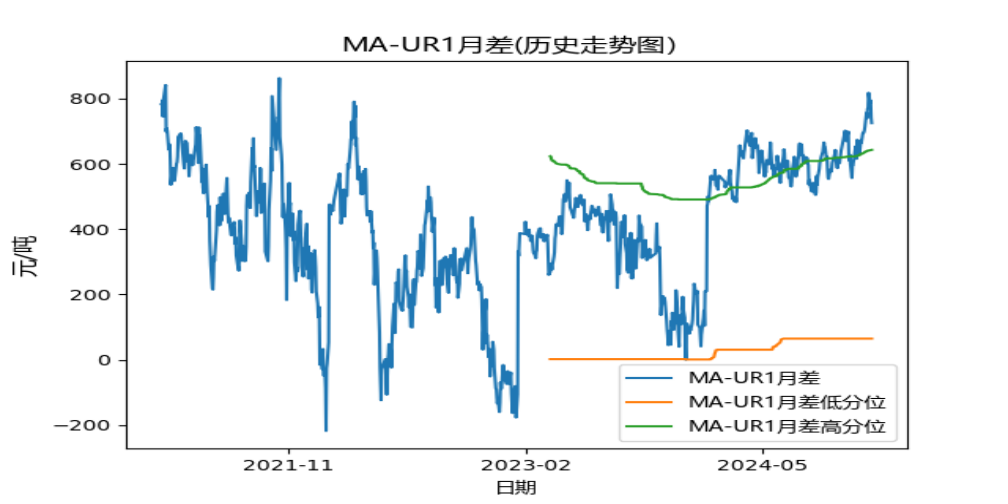 11月29日,MA-UR1月差为766,大于过去2年90%分位。过去5年最大值为863.0,过去5年中位数为430.0。过去1年最大值为818.0,过去1年中位数为587.0。2023年同期价差为109.0,2022年同期价差为-20.0。