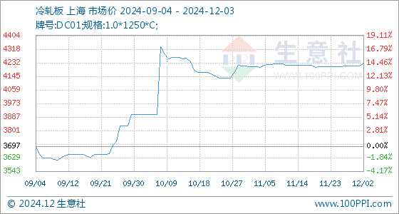 12月3日生意社冷轧板基准价为4227.50元/吨