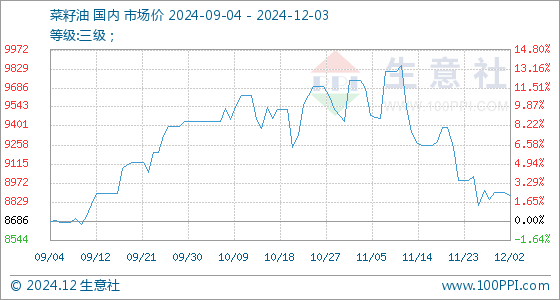 12月3日生意社菜籽油基准价为8881.67元/吨
