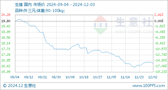 12月3日,生意社生猪基准价为16.63元/公斤,与本月初(16.72元/公斤)相比,下降了-0.54%。