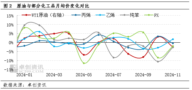 12月来看,原油月均价大体持稳,月内或呈现震荡调整行情。随着中东停火协议的即将达成,地区局势基本趋于平静,虽然俄乌依然存在不确定性,但是整体可控,地缘溢价逐步回吐。宏观上,美联储依然将延续降息政策,但是后续降息节奏料将放缓,美债收益率走高,美元偏强施压油价下行;但是从基本面来看,沙特减产有望延长,增产恐将进一步延后,市场对于沙特支撑油价信心较强,油价底部存在支撑。美国原油累库和需求弱化,基本符合季节性变化,对油价影响有限。因此,宏观施压,但是产业支撑,原油WTI或维持在70美元/桶上下波动,对化工品提振力度有限。