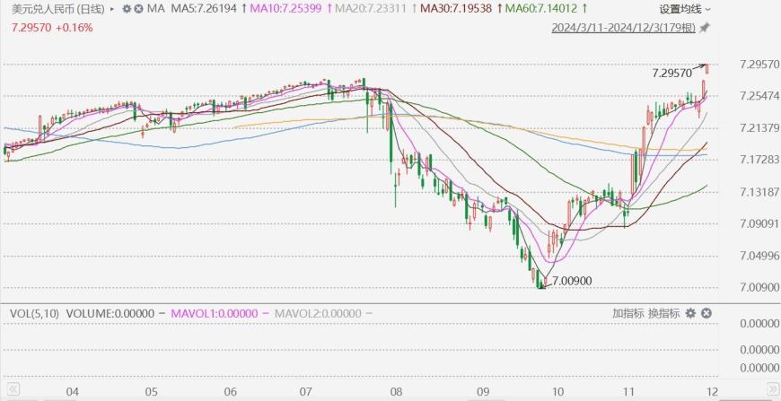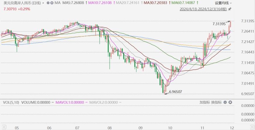 美国候任总统特朗普的关税威胁和法国政局动荡,推动美元走强,加上中国宽松预期加剧人民币下行压力,离岸人民币(CNH)今早跌穿7.31至7.31395,与在岸人民币(CNY)齐创去年11月以来的新低。在岸人民币早盘跌穿7.29至7.2957。