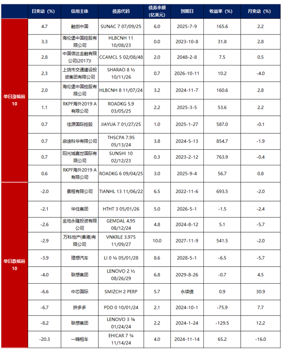 12月2日,7只产业债成交价格偏离幅度超10%,为“H1碧地04”跌超65%,“H0宝龙04”跌超66%,“H0阳城02”跌超74%,“H0阳城04”跌超95%;“20万科06”涨10%,“23中信02”涨超13%,“H1龙控01”涨超68%。