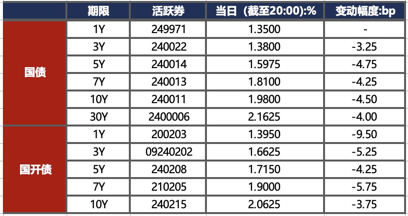 12月2日,存款自律新规落地,同业活期存款利率调降,加之机构抢跑配置,市场多头情绪高涨,债市大幅走强,10年期国债收益率下破2.0%。截至北京时间20:00,10年期国债活跃券240011收益率持下行4.50bp至1.9800%,10年期国开债活跃券240215收益率下行3.75bp至2.0625%。