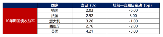 12月2日,除法国10年期国债收益率上行3bp外,其余主要欧洲经济体10年期国债收益率普遍下行。其中,德国10年期国债收益率下行6bp至2.03%,意大利、西班牙、英国10年期国债收益率分别下行1bp、2bp和3bp。