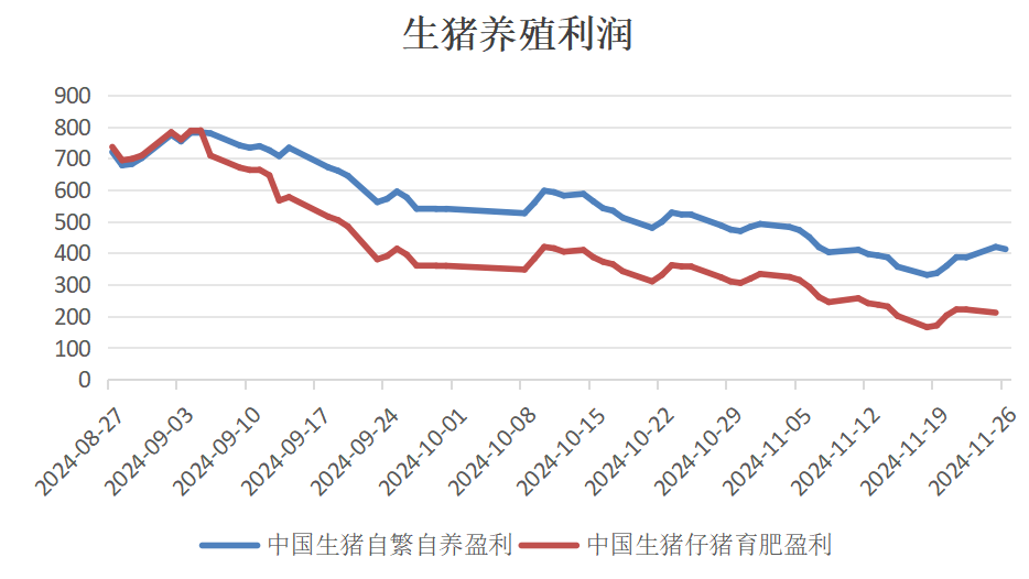 近期饲料原料变化不大,生猪饲料价格整体稳定,由于生猪价格反弹,养殖利润整体向好,生猪自繁自养利润提升较快,仔猪育肥利润相对偏弱。整体看目前生猪养殖仍有利润空间,今年腌腊需求启动较晚,随着气温下降,养殖户有一定压栏挺价情绪。
