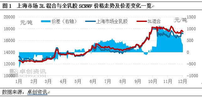 【导语】11月中下旬以来,伴随越南胶3L到港量逐渐增加,同时下游需求偏弱,面对高价原料采买积极性不高,国内越南胶库存有所增长,3L价格松动走弱;同时越南胶3L与全乳胶SCRWF的价差呈现收窄趋势。