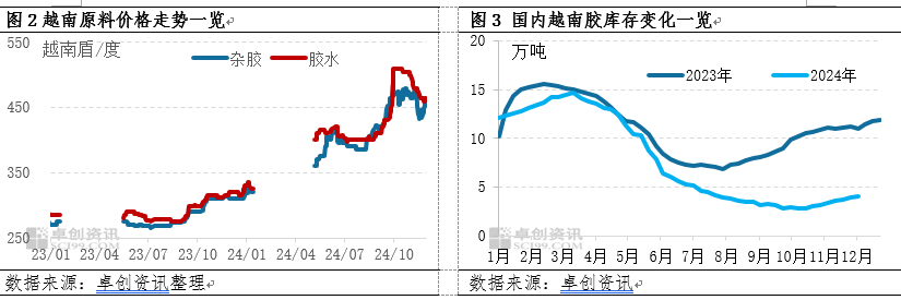 自10月份开始,越南中部、北部雨水偏多,但主产区东南部雨水逐渐减少,因此整体来看越南处于上量中;11月份东南部主产区基本处于旺产状态,当下原料价格对胶农割胶积极性刺激较高,原料呈现季节性增量表现,收购价格小幅回落但仍处于历史同期高位水平。截至11月底,越南主产区胶水收购价格参考465越南盾/度,较上月底下跌7%,但同比上涨45.31%。伴随新胶产出增量,越南橡胶出口量环比呈现增长趋势,且同比来看9-10月亦呈现上涨趋势。国内越南胶到港量增多,伴随前期订单陆续交付完毕,越南胶库存呈现缓慢累库趋势,价格运行承压。