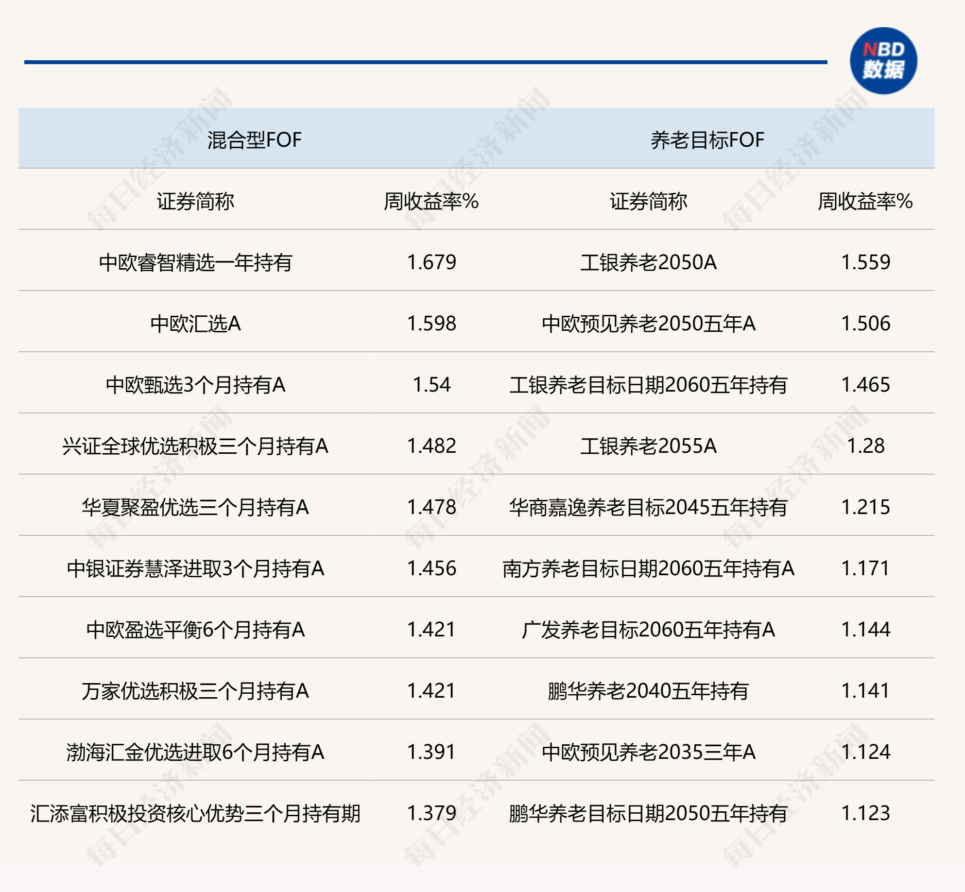 此外,连续多个周度考察当中,养老目标FOF的业绩表现也相对优异,上周工银养老2050A录得1.5589%的净值涨幅,中欧预见养老2050五年A录得1.5063%,还有工银养老目标日期2060五年、华商嘉逸养老目标2045五年等基金的业绩也都在上周表现出色。