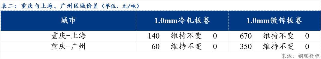 重庆、上海地区冷轧板卷区域价差维持不变;重庆、广州冷轧板卷区域价差维持不变。重庆、上海镀锌板卷区域价差维持不变;重庆、广州镀锌板卷区域价差维持不变。镀锌、冷轧品种价差维持不变;镀锌、热轧品种价差维持不变;冷轧、热轧品种价差维持不变。