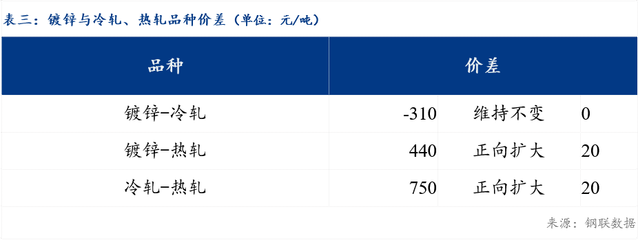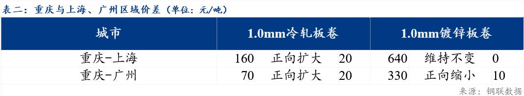 重庆、上海地区冷轧板卷区域价差扩大20元/吨;重庆、广州冷轧板卷区域价差扩大20元/吨。重庆、上海镀锌板卷区域价差维持不变;重庆、广州镀锌板卷区域价差缩小10元/吨。镀锌、冷轧品种价差维持不变;镀锌、热轧品种价差扩大20元/吨;冷轧、热轧品种价差扩大20元/吨。