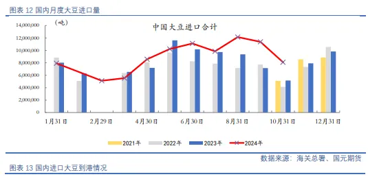 海关数据显示,10月我国进口大豆808.7万吨,同比增加56.7%,创近4年同期最高;1-10月累计进口大豆8993.6万吨,同比增加11.2%;10月大豆进口金额278.2亿元,进口单价3440元/吨,低于去年同期的4099元/吨;1-10月大豆进口金额3432.5亿元,进口单价3600元/吨。海关数据显示,10月我国进口食用植物油57.2万吨,同比减少39.8%;1-10月累计进口食用植物油596.3万吨,减少25.9%。植物油进口量减少主要是受棕榈油到货下降的影响;今年以来国际市场棕榈油价格较高,进口利润持续低迷,导致我国厂商买船数量较少。