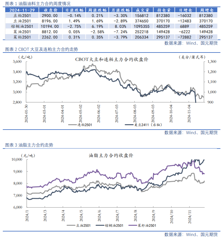 两粕:近期市场驱动寥寥叠加适逢美国假期,CBOT大豆走势以震荡整理为主。国内豆粕市场上,四季度后期随着美豆集中上市,国内进口大豆及豆粕预计将回归宽松格局,随着进入冬季猪肉腌腊高峰,出栏压力释放前豆粕需求存在提振,不过情绪面再度转弱,豆粕缺乏上行空间。菜系短期缺乏独立驱动,以跟随豆粕运行为主,不过国内菜粕库存偏高而需求疲软现状下,缺乏反弹驱动,后市仍需持续跟踪中加贸易软化的情况。