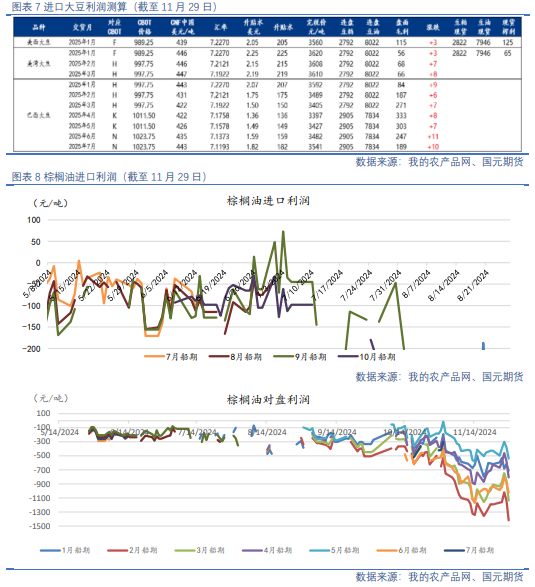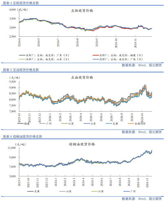 油脂:印尼官方再度重申B40政策将于2025年年初兑现,利好棕榈油,高频数据显示,马来西亚11月1-25日棕榈油产量环比下降3.24%,同期出口环比下降8.2%-9.2%市场预期11月末马棕库存降至180万吨附近。同时,马来西亚强降雨进一步加深供应担忧。国内来看,三大油脂现货伱格大幅回升,棕榈油强势凸显,进口利润倒挂使得近月棕榈油买船到港偏少,供应端收紧预期犹在,国内棕榈油库存去库加速。而豆油和菜油供给相对充足,现货价格跟涨动力略显不足。目前下游采购谨慎,油脂现货整体成交一般。
