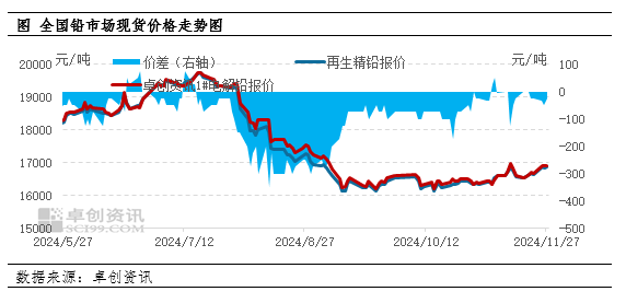 2024年11月再生精铅含税价格累计涨幅3.05%。根据卓创资讯统计数据显示,截至2024/11/27,全国再生精铅含税出厂主流价格16825-16925元/吨,均价16875元/吨;较上月底(2024年10月31日价格)涨500元/吨,涨幅3.05%;较去年同期涨850元/吨,涨幅5.30%。今年累计涨1375元/吨,涨幅8.87%。本月均价16624.47元/吨,较前一个月均价涨280.03元/吨,涨幅1.71%。