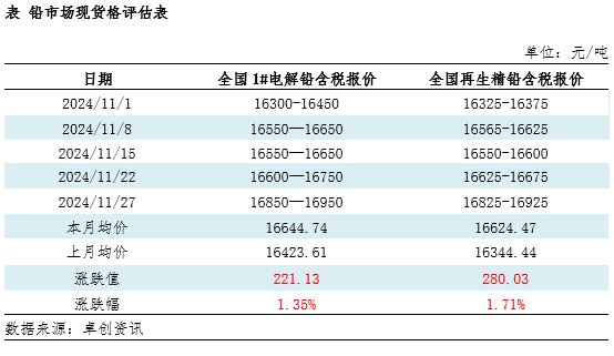 2024年11月国内现货铅价重心上移,累计涨幅3.05%。根据统计数据显示,截至11月27日,卓创资讯现货1#电解铅报价16850—16950元/吨,均价16900元/吨;较上月底(2024年10月31日价格)涨500元/吨,涨幅3.05%;较去年同期涨750元/吨,涨幅4.64%;今年累计涨1275元/吨,涨幅8.16%。本月均价16644.74元/吨,较前一个月均价涨221.13元/吨,涨幅1.35%。本月国内现货电解铅供应偏紧。