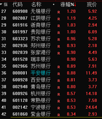 个股方面,42家银行股全线飘红。厦门银行以4.73%的涨幅领衔,重庆银行大涨3.73%跟随其后,上海银行、华夏银行也分别大涨了3.58%、3.10%,邮储银行等5股涨幅超过了2%。“工农中建交”涨幅1.31%-1.64%不等。