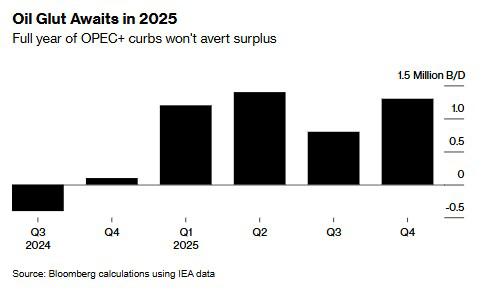目前,该联盟面临着一个令人不安的两难困境:要么将限产措施延长至2025年,要么冒着将全球市场推向供过于求的风险。国际能源署(IEA)表示,即便将限产措施延长至全年,也无法阻止相当大的供应过剩。自7月初以来,原油期货价格已经下跌了17%。
