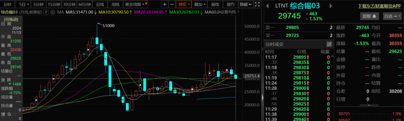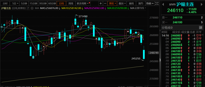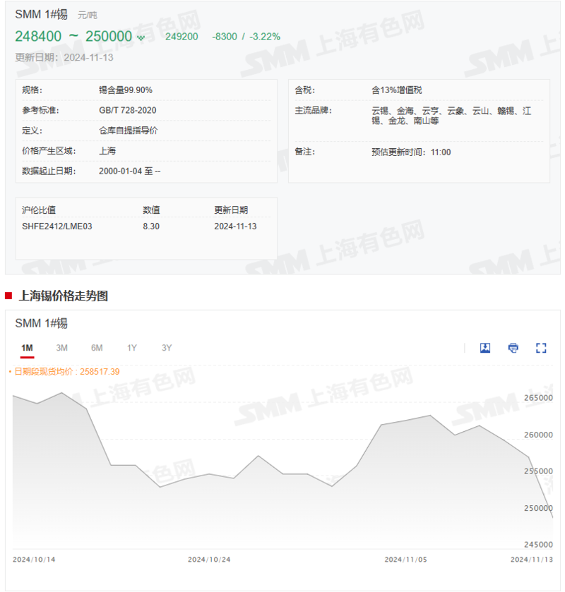 SMM11月13日讯:国内锡库存累库,市场对佤邦复产预期升温、印尼或将大量出口锡的预期以及特朗普当选总统以后带来的美元走强使得金属承压等均给锡价走势带来冲击,截至11月13日14:16分,沪锡跌4.4%,报246110元/吨,其11月的月线跌幅暂时为3.21%,这一跌幅已经超过了沪锡10月月线3.02%的跌幅。截至11月13日14:18分,伦锡跌1.53%,报29745美元/吨,其11月月线跌幅暂时为4.7%,而其10月月线跌幅为7.39%。