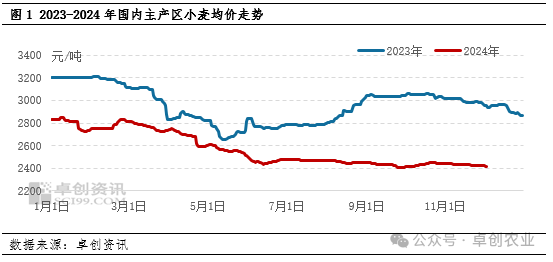 月初面粉企业小麦收购价格陆续下调,上月底的上涨持续时间短且幅度有限。截至12月3日,卓创资讯监测的主产区小麦均价为2416.75元/吨,较上周五跌幅0.15%。以山东菏泽大型企业小麦收购价为例,上周五收购价格上调0.003元/斤,而今日又下调0.003元/斤,潍坊地区面粉企业收购价在持稳一段时间后,近两日亦出现连续下调,累计下调0.005元/斤。虽然从幅度上不大,但各地厂家小麦收购价出现高频、范围的下调,对于市场信心有一定扰动。