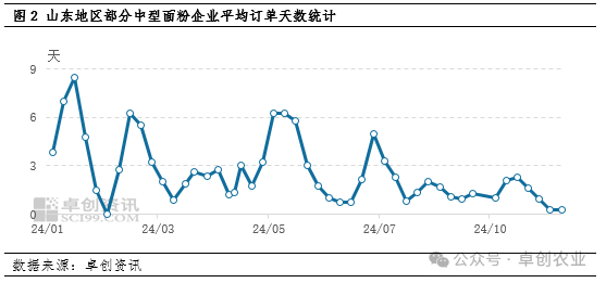 部分企业面粉订单上周因月底前任务量而稍有增加,但本周订单再次转少,据卓创资讯调研了解,部分中小企业近日有再次停机的计划,因面粉订单稀少,面粉库存积压。部分企业虽然维持正常生产状态,但面粉日订单量亦不多,多数维持随订随销的局面,少部分企业有1天左右的排单,卓创资讯监测的山东省内部分中型企业平均订单天数在0.5天左右。企业整体加工需求不高,且短期的加工计划需求亦不高,限制企业小麦加工用量。