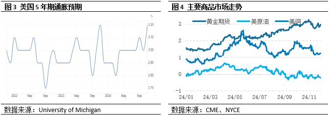商品市场主线:长期通胀预期抬头。特朗普交易另一方向就是对于其保护主义政策下对全球商品贸易格局的再平衡风险,即推升商品市场的贸易流通成本进而影响商品市场走向再通胀格局。由密歇根大学编制的未来五年美国通胀预期在2024年11月被略微上调至3.2%,为一年中的最高水平,相比此前估计的3.1%和10月的3%有所上升。从具体商品价格走势来看,11月上旬在强美元影响下明显下跌,随后则转入震荡格局,交易重心逐步转向再通胀。