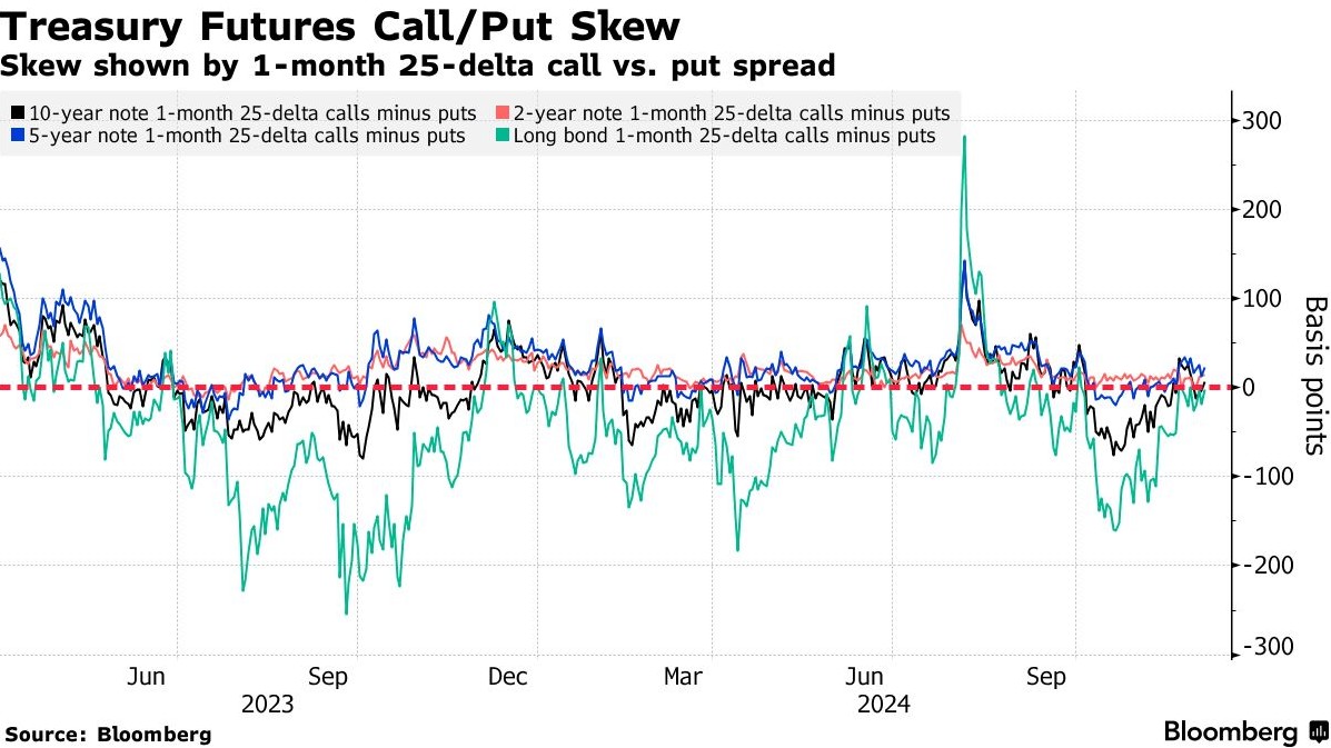 在过去的一周里,对冲债券市场波动的成本趋向均衡。继11月底看跌押注的需求激增之后,对于10年期美国国债收益率上升的下行保护需求在最近一周有所减缓。