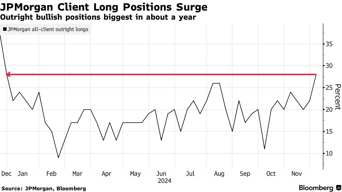 截至12月2日的一周内,摩根大通的客户直接持有的多头仓位增加了6个百分点,从而摆脱了中立状态,而空头仓位则保持不变。所有客户的直接多头仓位攀升至自12月11日以来的最高点,同时净多头仓位也达到了自11月4日以来的最高水平。
