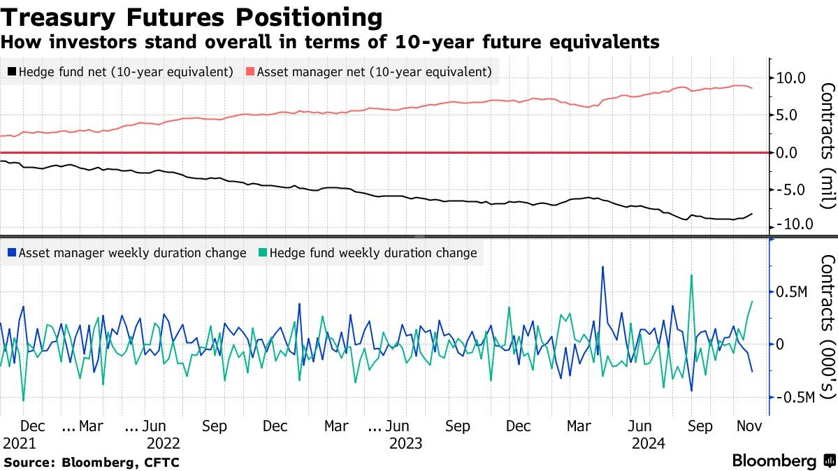 在截至11月26日的一周内,对冲基金在美国国债期货市场上显著减少了空头头寸,具体回补量约为417,000份10年期美国国债期货等价物,创下自8月27日以来的最大净空头回补记录。在同一时期,资产管理公司则大规模平仓多头头寸,平仓量约为265,000份10年期美国国债期货等价物,这也是自8月27日以来的最大多头平仓量。