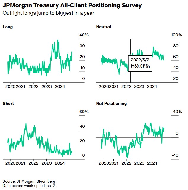 债券交易员正积极备战美国国债市场的新一轮上涨,他们预期收益率将从唐纳德·特朗普胜选后的高点继续回落。摩根大通发布的最新调查显示,其客户已大幅增持美国政府债券的多头头寸至一年高位,标志着从中立立场向看多立场的转变。这一变化紧随过去两周美国国债价格的上涨,而这得益于财政部债券拍卖所展现的强劲需求。