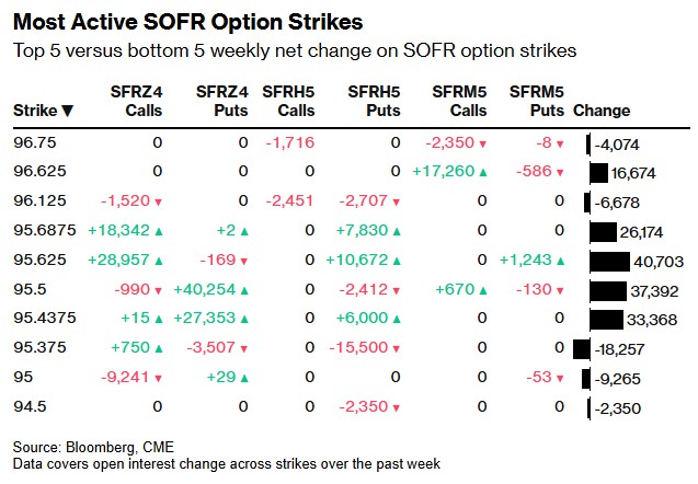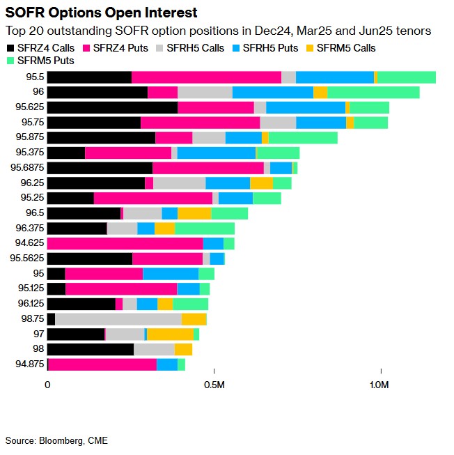 在SOFR期权市场中,对于12月24日、3月25日和6月25日这三个到期日的期权合约,目前有20个未平仓头寸是市场上最大的。这些头寸代表了市场上最大的交易量或者关注度最高的期权合约,它们通常是市场参与者用来对冲风险或者进行投机的工具。