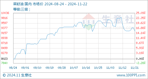 11月22日生意社菜籽油基准价为9240.00元/吨